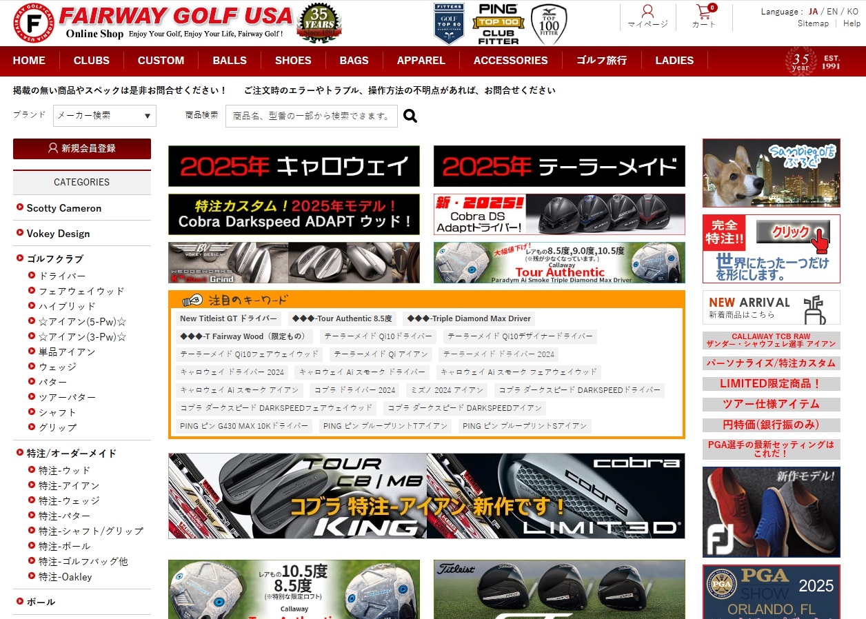 公式サイトはこちら フェアウェイゴルフについて フェアウェイゴルフは1991年にアメリカ・カリフォルニア州のサンディエゴにオープンいたしました。 今は、USA・カリフォルニアに2店舗展開し、多数の有名人や世界中のゴルフファンの方々に足を運んで頂いております! 日本へは公式サイトを通じて、「国内未入荷モデル」「US限定モデルのレアもの」 「US限定のゴルフクラブ」「日本より安いモデル」「日本より早期発売されるモデル」など最新情報をお届けしています。 商品名 フェアウェイゴルフ カテゴリ 未分類