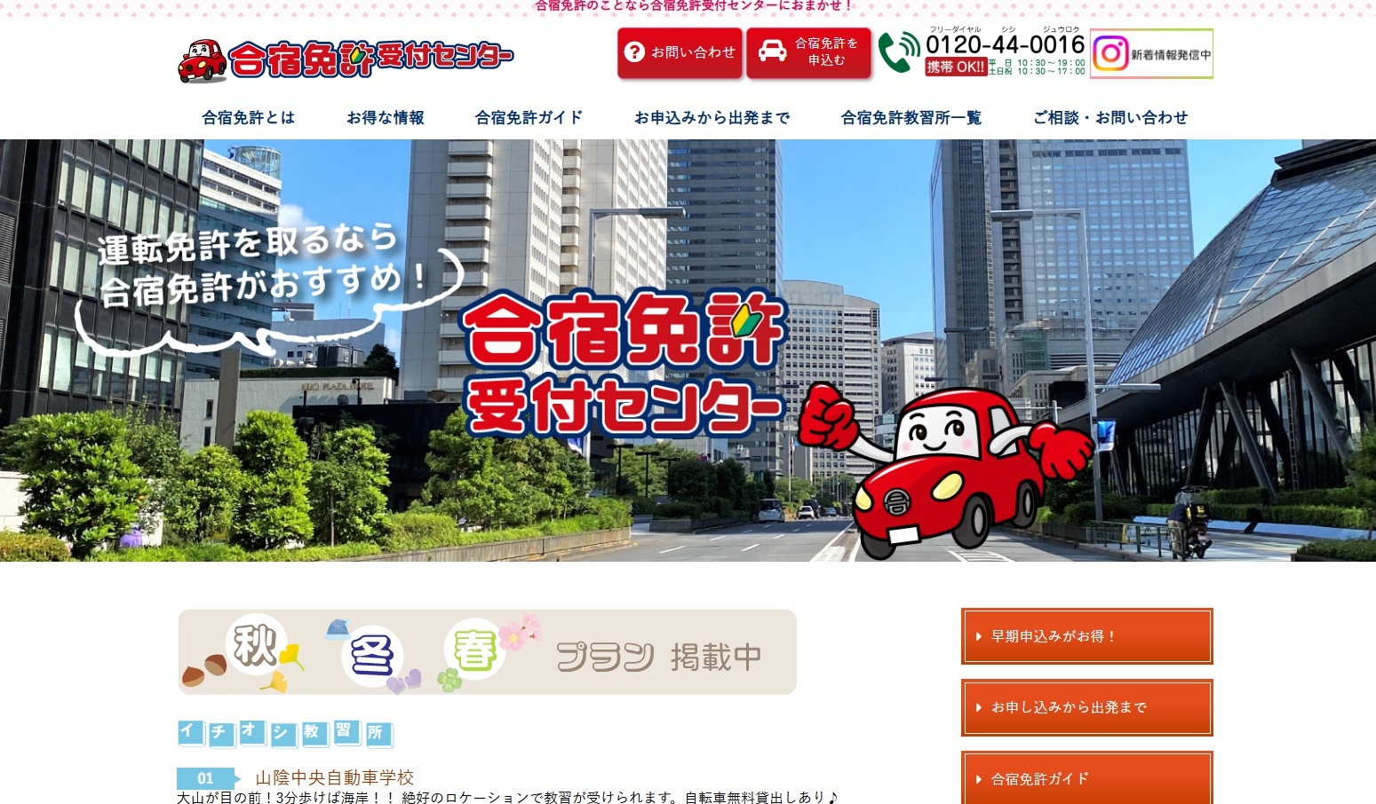 公式サイトはこちら 合宿免許受付センターについて 合宿免許受付センターです。 名前の通り自動車の運転免許を合宿して格安、短期間で取得するコースをご紹介しております。 日本全国から申し込みができ、温泉旅行を兼ねて運転免許を取得するのもよし、友達と一緒に旅行気分で運転免許を取得するもよし。 楽しく最短14日で運転免許が取得できます。 商品名 合宿免許受付センター カテゴリ 未分類