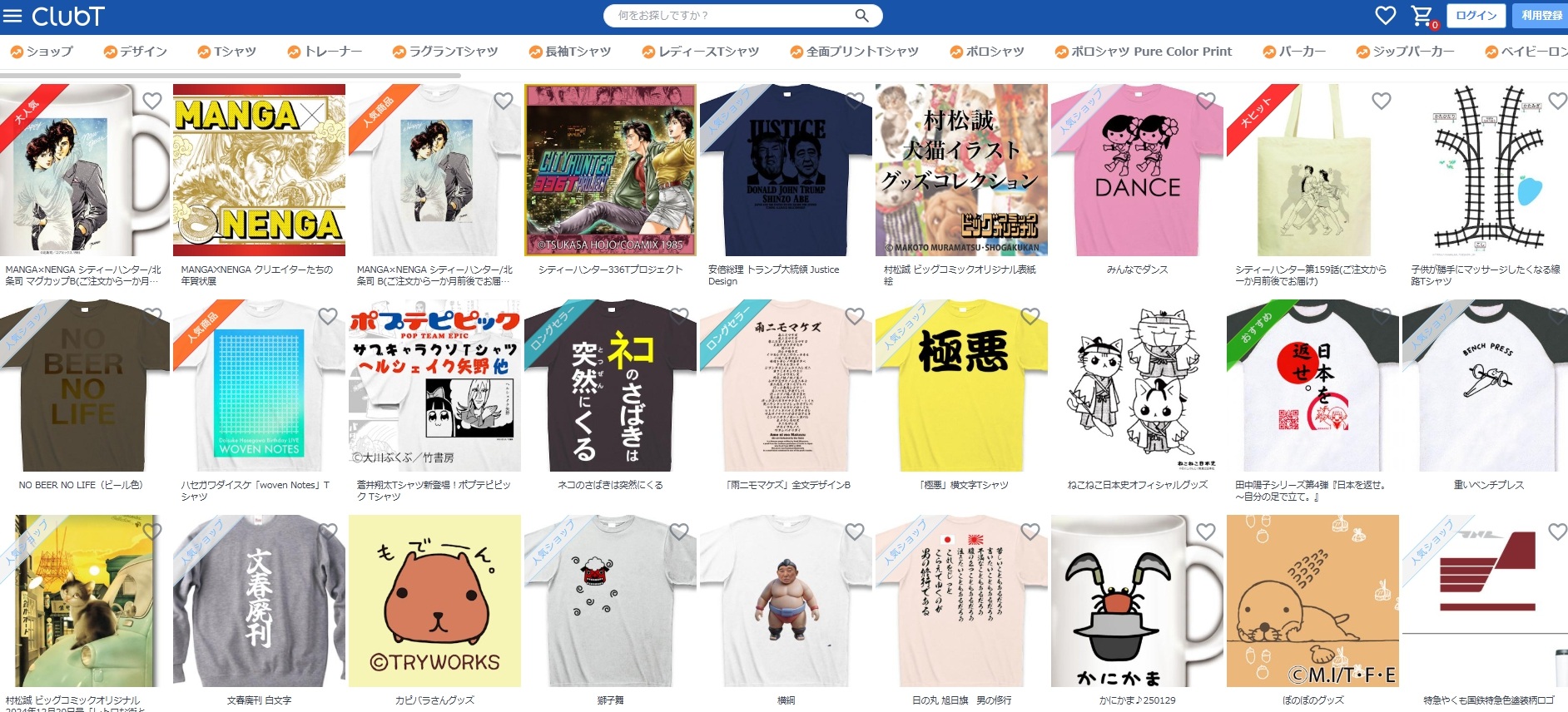 公式サイトはこちら ClubTについて メインのTシャツでは キャラクター・漫画・有名人など シーズンやトレンドに合わせた非常に多くのデザインの取り扱いがある他、 既にデザインされたものだけでなく ご自身でデザインしたTシャツを購入することもできます! デザインTシャツは1枚から作成可能となっているので、 イベントや行事に使うものから自分自身のためのものまで 多様なニーズに対応することができます! 商品名 ClubT カテゴリ ファッション