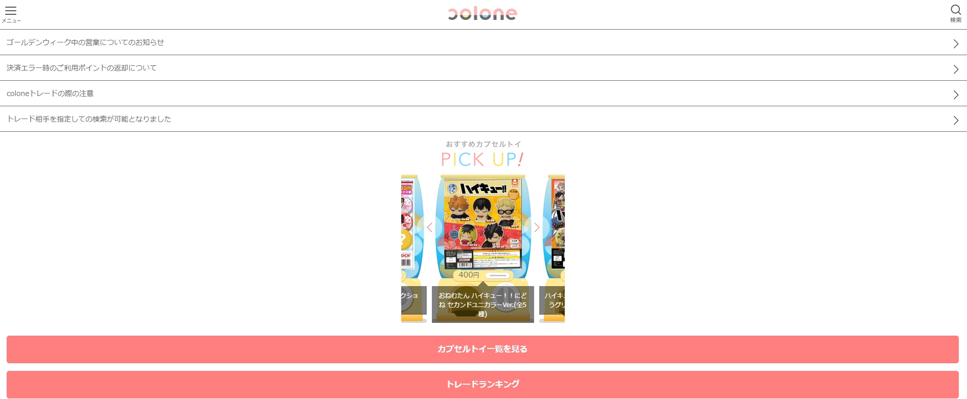 公式サイトはこちら colone(コロネ)について オンラインで、カプセルトイが購入できるサービスです。 買ったその場で何が出たかわかるようになっており、サイト内ではユーザー同士で商品をトレードすることも出来ます。 オンラインで購入でき、買ったその場で店頭購入と同じように中身もわかるサービスとしては初のサービスになります。 商品名 colone(コロネ) カテゴリ 未分類