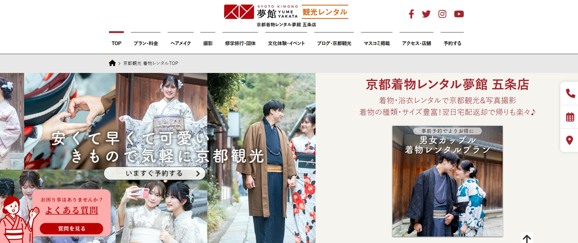 公式サイトはこちら 京都着物レンタル夢館 五条店について 京都着物レンタル夢館は、京都で江戸時代に創業した老舗呉服店が営む着物レンタル店です。 他店では「最安値は着たい着物がなく、結局上位プランでお金がかかる」ということがありますが、 夢館はほとんどが均一3,030円で着物も帯も自由に選べます。 TV番組、雑誌、イベント等、多数のメディアからの取材協力、衣装提携実績豊富。 京都No1人気店としての信頼と実績から、日本だけでなく海外からのメディア・有名人も多く来店頂きます 商品名 京都着物レンタル夢館 五条店 カテゴリ 未分類